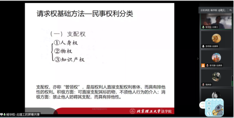 杨教授先从民事权利分类入手,系统讲解请求权基础这一概念,塑造了完整的概念来源。随后,在请求权基础部分,杨教授分别讲授了“什么是请求权基础”,“法律条文的类别”和“请求权基础的检视次序”等多个内容,重点突出请求权基础的检视次序所具有的重要意义,并通过引入案例讲解,加深了与会同学对相关知识的理解和把握。