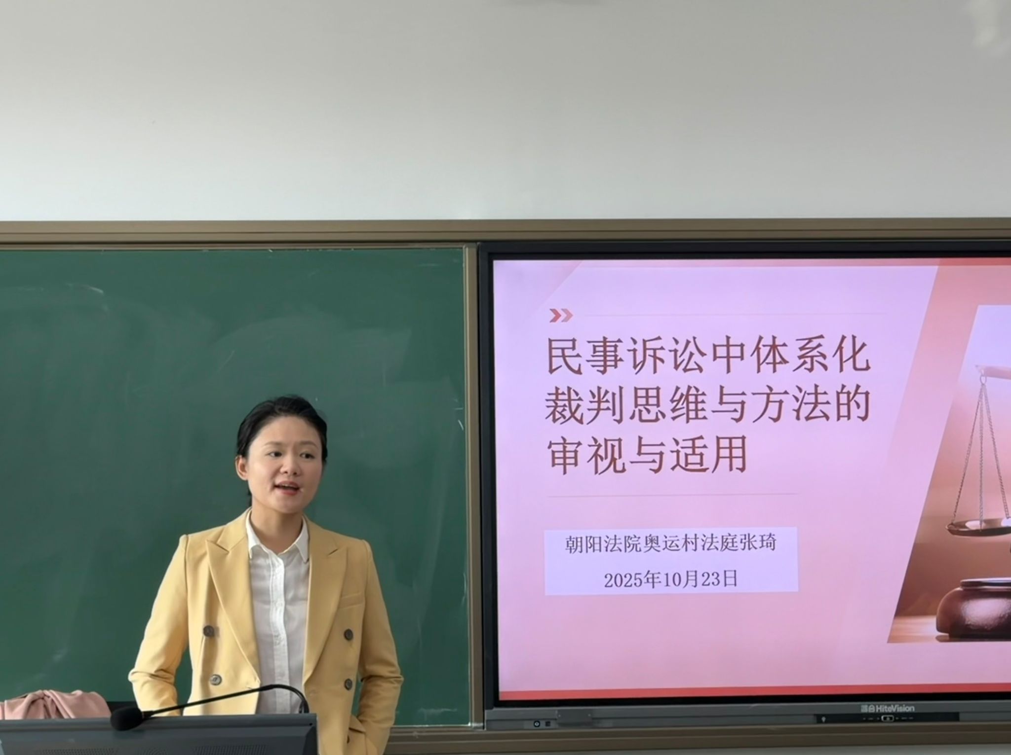 2025年10月23日上午,w66利来旗舰厅特邀北京市朝阳区人民法院奥运村人民法庭张琦副庭长,于教学楼323教室举办了一场主题为“民事诉讼中体系化裁判思维与方法的审视与适用”的专题讲座。讲座在公司李丹老师对张庭长及其所在法院、法庭以及讲座主题进行系统介绍后拉开帷幕。