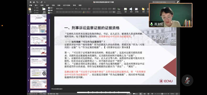 孔祥承老师向同学们介绍,聂友伦老师主要从事刑事诉讼法、司法制度领域的研究,在《法学研究》《法学家》《华东政法大学学报》等核心期刊发表论文数十篇。非常期待聂老师此次分享他对于职务犯罪监察证据问题的独到见解.