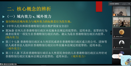 霍教授首先就第一部分问题展开讲授。他通过分析新近颁布的“港区国安法”的域外效力和长臂管辖的概念来源与内容,为同学们辨析了“域内效力”与“域外效力”,“域外效力”与“长臂管辖”两组概念,为深入认识、解决这一问题作出了知识性的铺垫。随后,霍教授从“扩张美国法域外效力的显性推手国会与总统”和“美国公法域外效力的隐性推手联邦法院”两个视角入手剖析,通过对美国宪法以及不同历史阶段相关法律的颁布和体系构成的详细解读,为与会同学展现了美国法域外适用体系的发展演进与模式解构,带领同学们分析了美国法域外适用体系的运作原理及发展趋势,加深了同学们对这一问题的把握和思考。