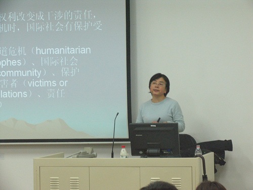 在进一步的分析中,她把讲座关注的主题提升到更高的层次:基于国际社会的责任意识而诞生的R2P概念及其期待的保护机制与国际法传统理论中所坚持的主权原则、不使用武力原则与联合国安理会机制等方面的冲突问题。白教授为此次讲座的内容进行了充分的准备,展示了国际法理论的前沿发展,介绍了不同的观点和立场,还向我们推荐了不少相关书籍及文章,并鼓励我们在课余多学习多探讨相关问题。