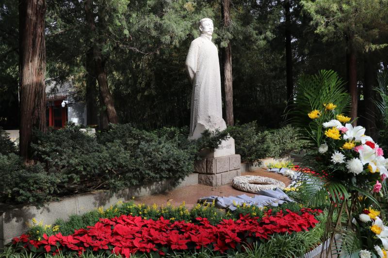 早晨8:00,法律系师生抵达目的地。在香山脚下,远望山犹龙腾,逶迤而来,而前夜的春雨冲刷掉了墓园中石碑和雕像上的尘土,万安公墓在这晨光之中更显庄严、肃穆。在工作人员的带领下,法律系师生来到了李大钊烈士陵园内。