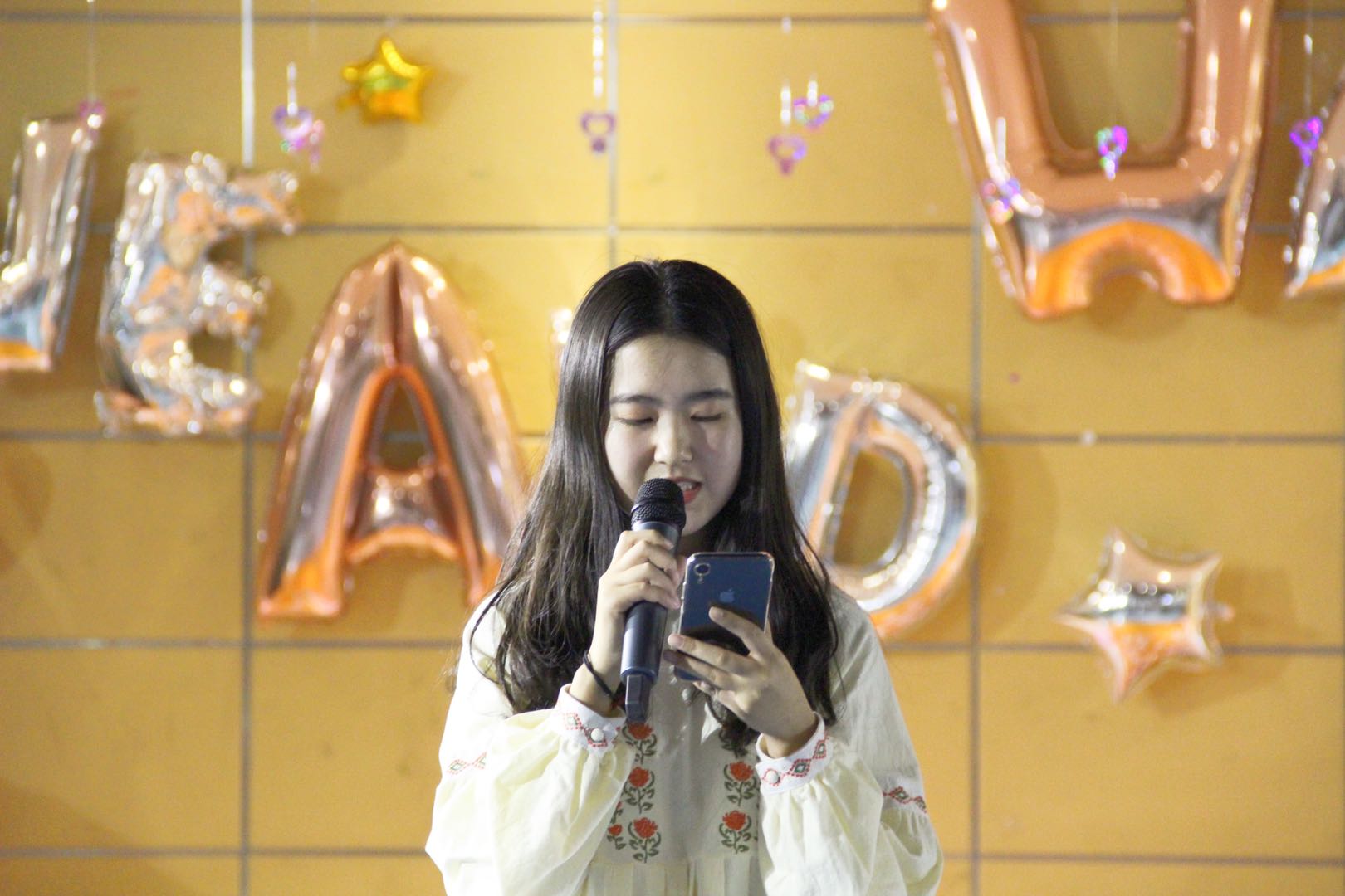网红歌曲的出场瞬间点燃了同学们的热情。浓厚的东北地方特色,激扬的旋律,魔性的rap,杨烽巍师哥以不俗的唱功和帅气的身姿成功hold住全场,不少同学也跟随着音乐摇摆歌唱,挥舞荧光棒,晚会随之进入了一个高潮。