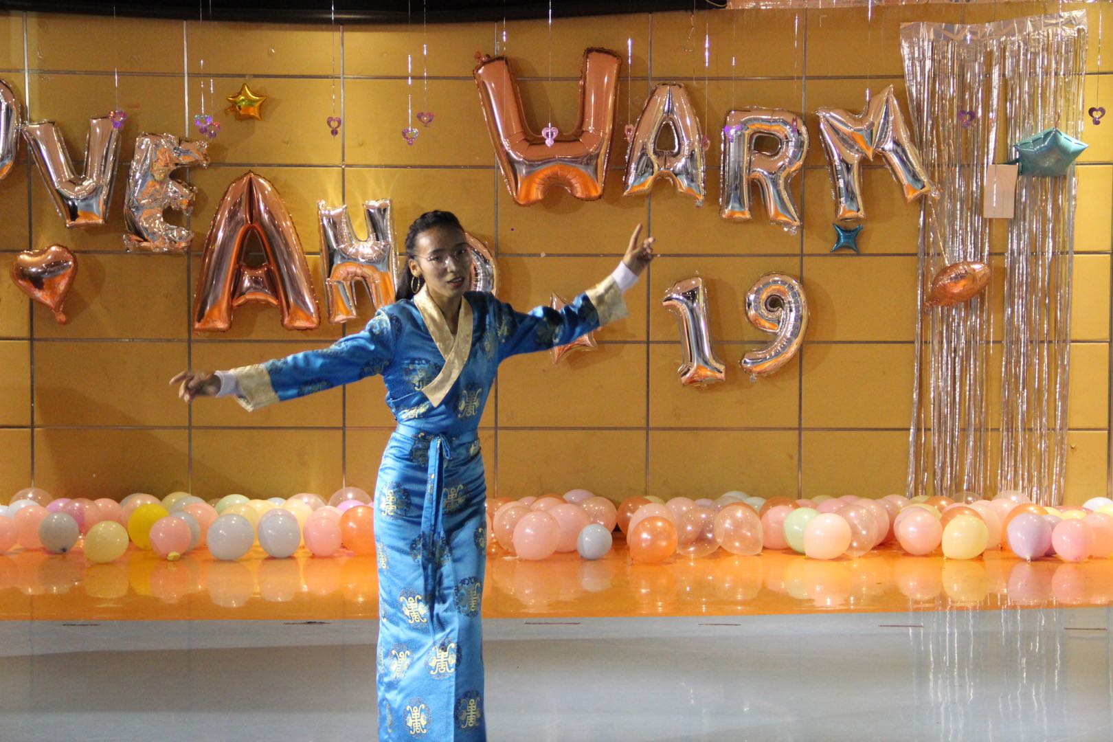 在56个民族一家亲的和谐氛围下,我们有幸迎来了一位藏族同学的表演。身着藏服的她在悠扬舒畅的旋律中尽展古朴典雅之美。我们的眼前仿佛也缓缓展开了藏族人民在篝火前尽情歌唱舞蹈的迷人画卷。
