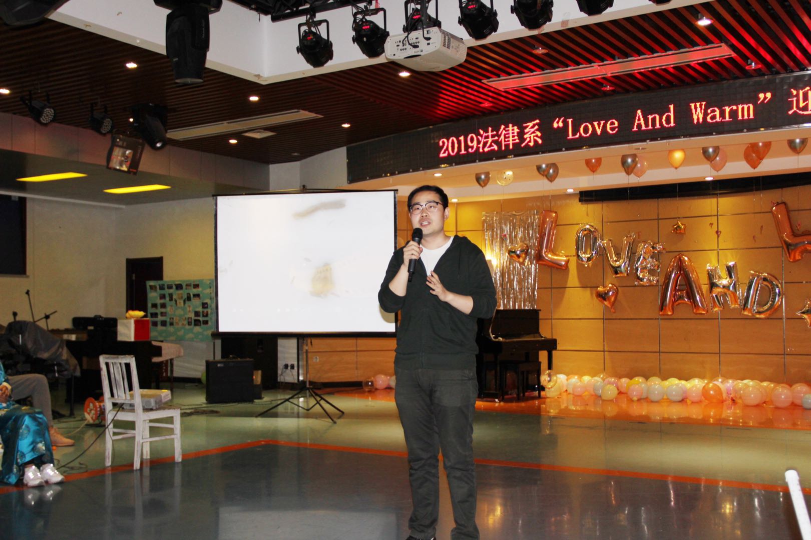 赵思斯老师,夏庆锋老师,员工处祖木来提老师来到现场参加晚会。赵思斯老师随后发表晚会开幕致辞,赵老师首先代表法律系各位老师对同学们加入法律系大家庭表示热烈的欢迎和由衷的喜悦,提出同学们要把握好大学交友的黄金时期,怀揣真挚的感情相处的建议,并对晚会准备工作做出了高度赞扬。