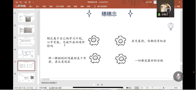 第三位分享的是肖穗兰师姐,她考研上岸中央财经大学法律硕士。学姐在考研书籍方面做出了许多分享,政治推荐肖秀荣和腿姐,英语推荐朱伟5500词和红皮书,专业课则推荐考试分析新旧版本。学姐还介绍了自己的时间规划,3月到6月准备第一轮专业课和朱伟5500词,日均5h,7月到9月进行专业课第二轮,英语和政治,时间也应有所增加,9.10月则要加上政治一轮的学习,时间增加到7-8h,等到10月中旬至12月,便应该进行专题、技巧与背诵了,在最后的12月,各项都进入冲刺阶段,时间上自然是尽力挤压。最后,学姐还提醒后辈们注意英文书写,这在作文板块很重要。