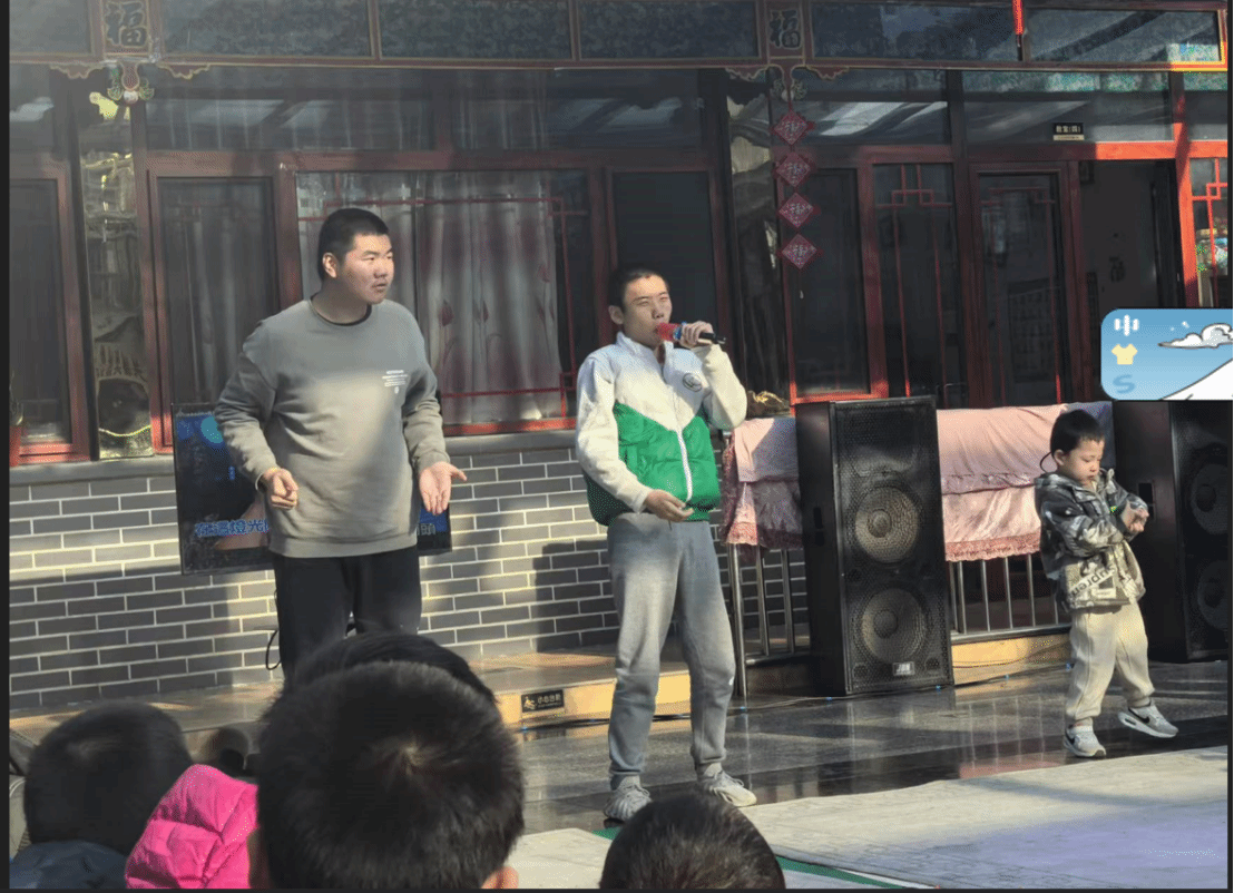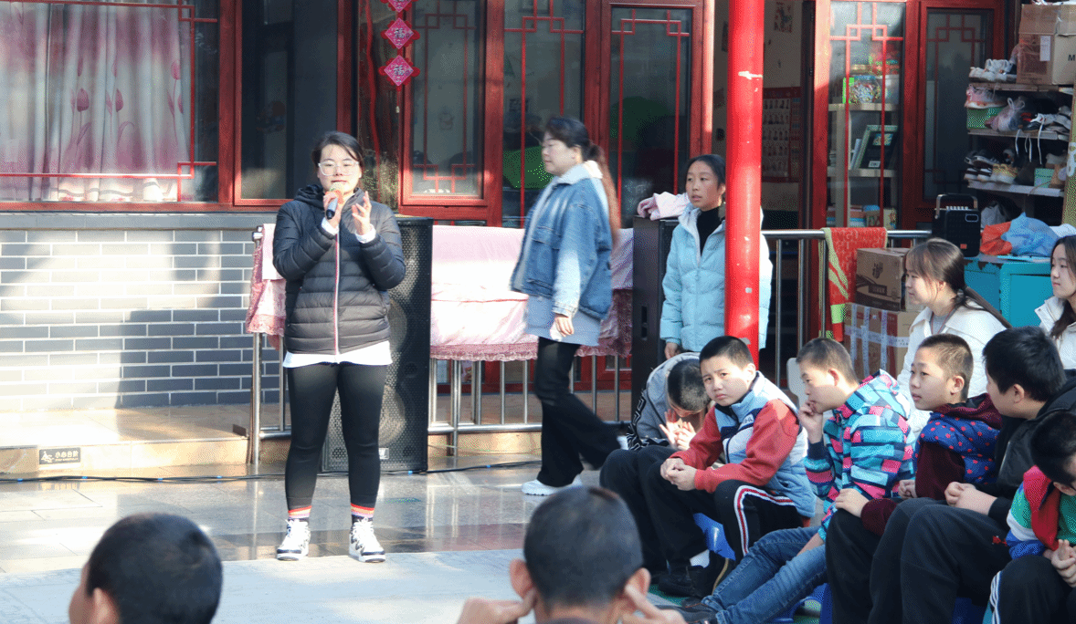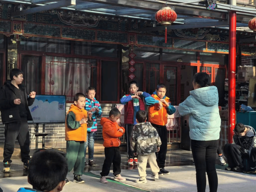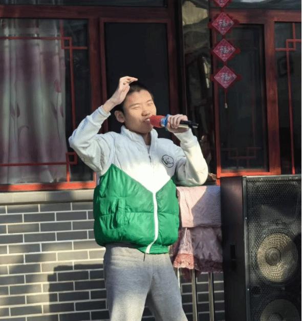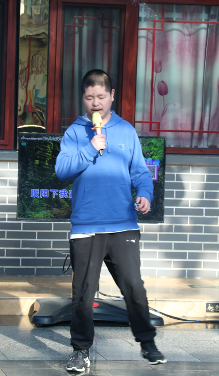 志愿者们认真聆听了孩子们的基本情况后,在老师的组织下,来到院子和小朋友们见面。孩子们用稚嫩的声音热情地和志愿者们打招呼:“哥哥姐姐们好!”志愿者们也积极回应着小朋友的问好。经过老师们的耐心引导和康复训练,一些小朋友已经可以较为顺畅地和志愿者们交流。很快,几位小朋友就和志愿者们愉快地互动起来。开场节目是由一位特殊小朋友带来的他的拿手歌曲——《兄弟》。他手拿话筒,随着音乐摇摆,自信满满地完成了表演。另一位小朋友带来了诗朗诵《七律长征》,声音洪亮,朗诵得十分熟练。从完全没有语言表达能力到现在可以独立完整地完成表演,如此翻天覆地的变化不禁让志愿者们感叹老师们在背后的辛勤付出。