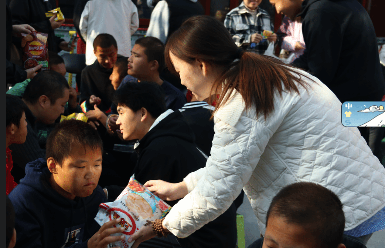 活动接近尾声,终于到了孩子们翘首以盼的环节——分零食。志愿者们带着满满的爱心和精心准备的零食走进特殊儿童中间。他们温柔地蹲下身子,将一袋袋零食递到孩子们手中。孩子们的眼睛瞬间亮了起来。有的孩子迫不及待地撕开包装,小脸上洋溢着纯真的快乐,嘴里嘟囔着含糊不清的“谢谢”,有的孩子则紧紧抱着零食,脸上露出羞涩又满足的笑容。志愿者们还细心地帮助那些行动不便的孩子打开零食,欢声笑语在房间里回荡,每一个零食都是一份温暖的传递。最后,志愿者们和小朋友们留下了宝贵的合照。