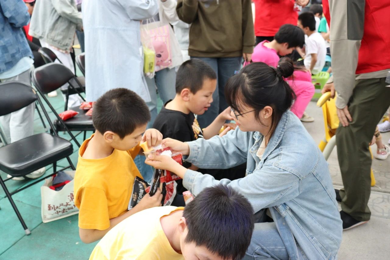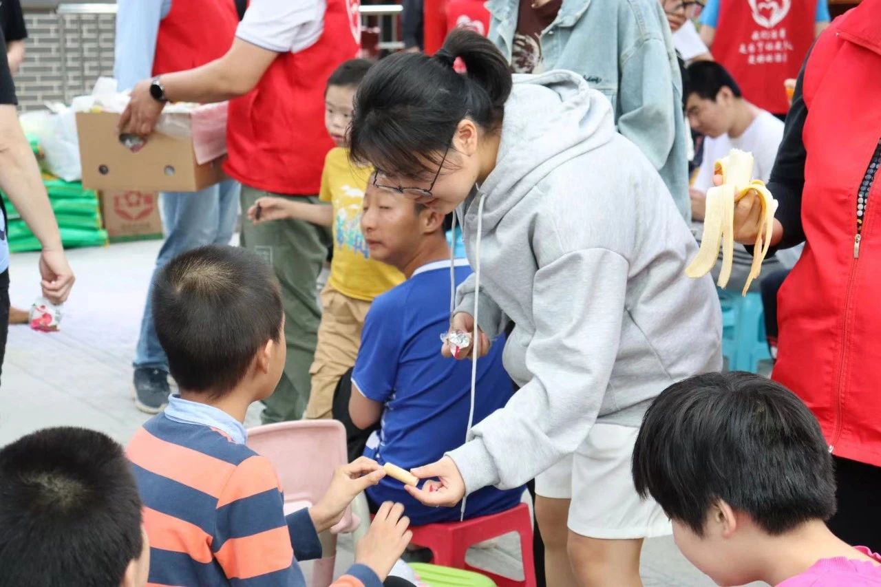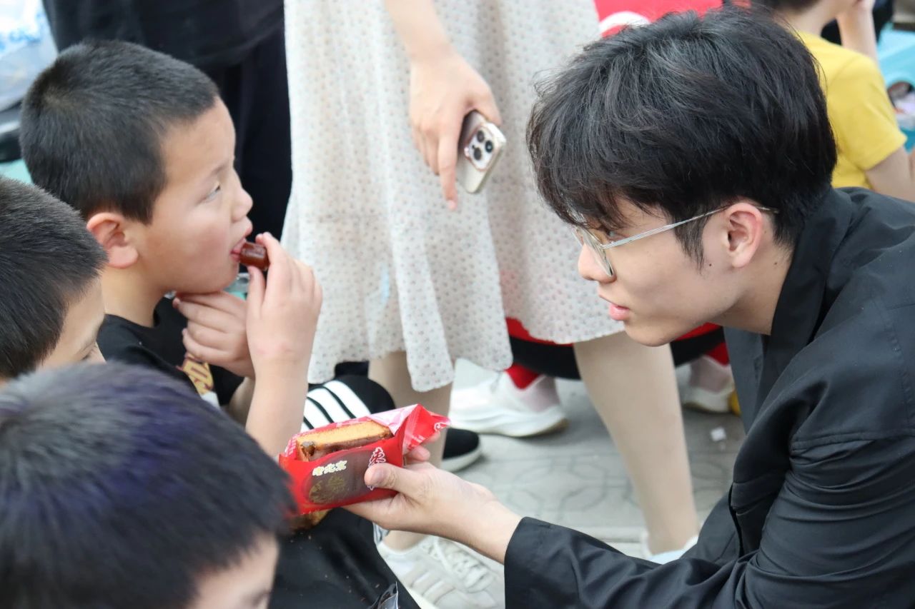 随后,志愿者们还与孩子们进行了更近距离的接触。他们紧紧陪伴在孩子们身旁,剥开零食袋、剥开香蕉皮,小心翼翼地将它们递给孩子们。孩子们看着美味的食物,不觉露出灿烂的笑容,志愿者们看着孩子们,便也跟着不由自主地笑了。志愿者们把爱传递给孩子们,也感受到了来自孩子们纯真的爱意。