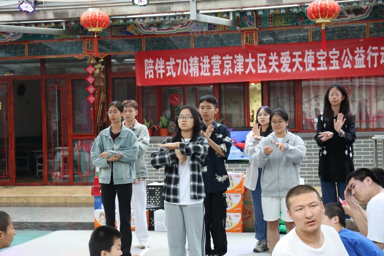 初步介绍基本情况后,在老师的组织下,志愿者与特殊儿童进行了互动交流。8位志愿者一起表演了他们在活动前精心准备的手势舞《一起向未来》,将那份对明天的期许用无声的语言传达到活动的空间。接着,全体志愿者们一起合唱,为孩子们献上一曲《让世界充满爱》,舒缓的节奏里包含关爱与深情。正如音乐中那句“深深地凝望你的眼,不需要更多的语言”……虽然并不是每一个孩子们都能听懂志愿者们歌唱的内容,但这份情真意切的告白定能带给他们温暖的感受。