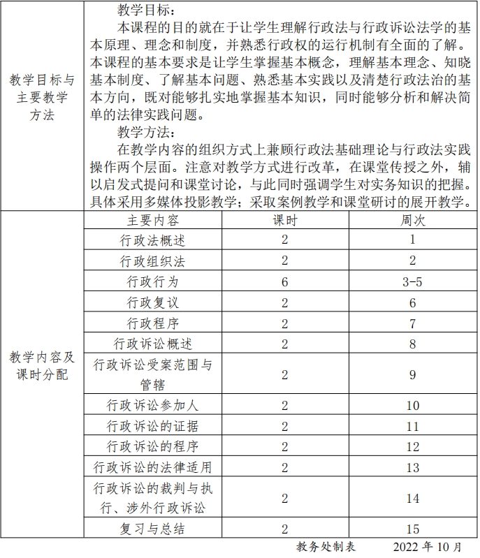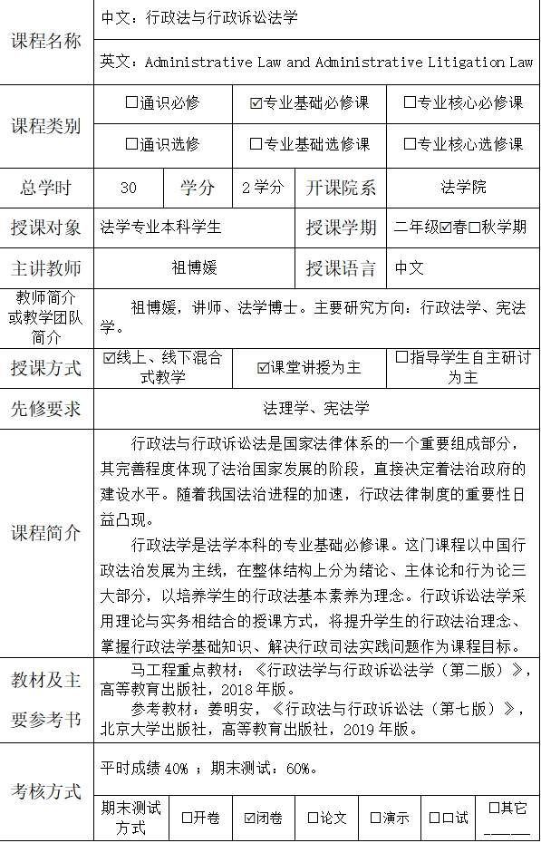 教学方式:在教学内容的组织方式上兼顾行政法基础理论与行政法实践操作两个层面。注意对教学方式进行改革,在课堂传授之外,辅以启发式提问和课堂讨论,与此同时强调员工对实务知识的把握。