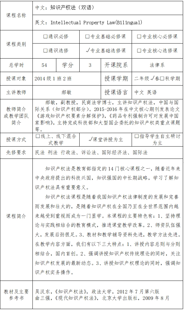 《知识产权法学》属于教育部规定的法学专业十四门核心课程之一,也应是法学专业员工的专业必修课。本课程旨在使员工掌握知识产权法的基本原理和主要制度,掌握我国主要知识产权法律包括《著作权法》、《专利法》和《商标法》,熟悉中国知识产权立法、司法及执法现状,了解知识产权法律制度历史演变与发展趋势,并能应用所学理论分析实际问题、提出解决方案。在授课过程中还将穿插介绍知识产权国际保护现状、主要国际组织和主要国际公约,特别是世界贸易组织、世界知识产权组织、《与贸易有关的知识产权协议》、《保护工业产权巴黎公约》和《保护文学产权伯尔尼公约》等。要求员工全面掌握知识产权概念的来源和知识产权的范围、知识产权的概念和特征,明确知识产权的法律性质等。