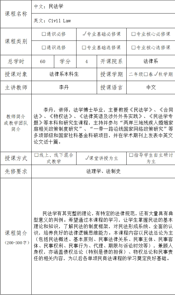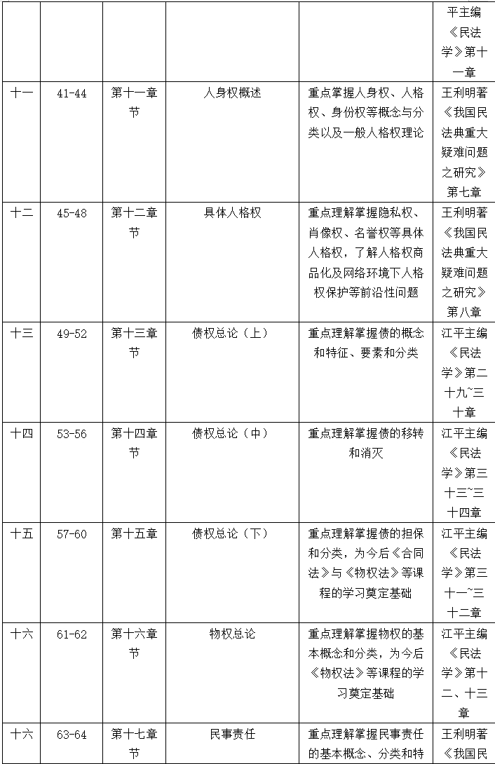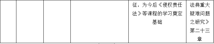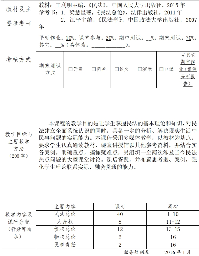 教学内容和方式:理论教学环节以教材为基点,教师讲授为主,师生互动提问为辅,不断强化理解记忆;案例剖析环节围绕预留教学案例展开,师生共同研讨,明确重点,搞懂疑难点;实践应用环节,结合社会生活中的实际案例特别是争议较大的热点案例,布置思考题,鼓励员工自行研究,深入思考,课堂发言,教师点评。课程采用多媒体教学,文字课件外,穿插视频案例、新闻访谈、专家讲座以及涉及当今民法前沿问题的大型课堂讨论等。