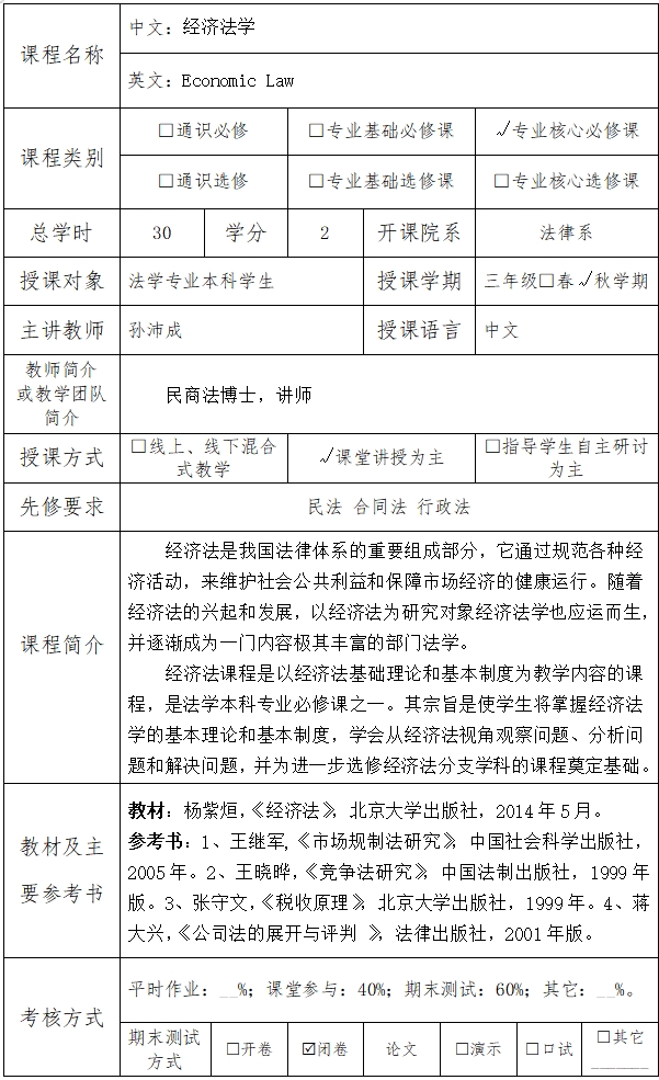 课程英文名称:Economic Law