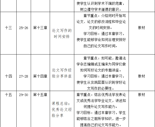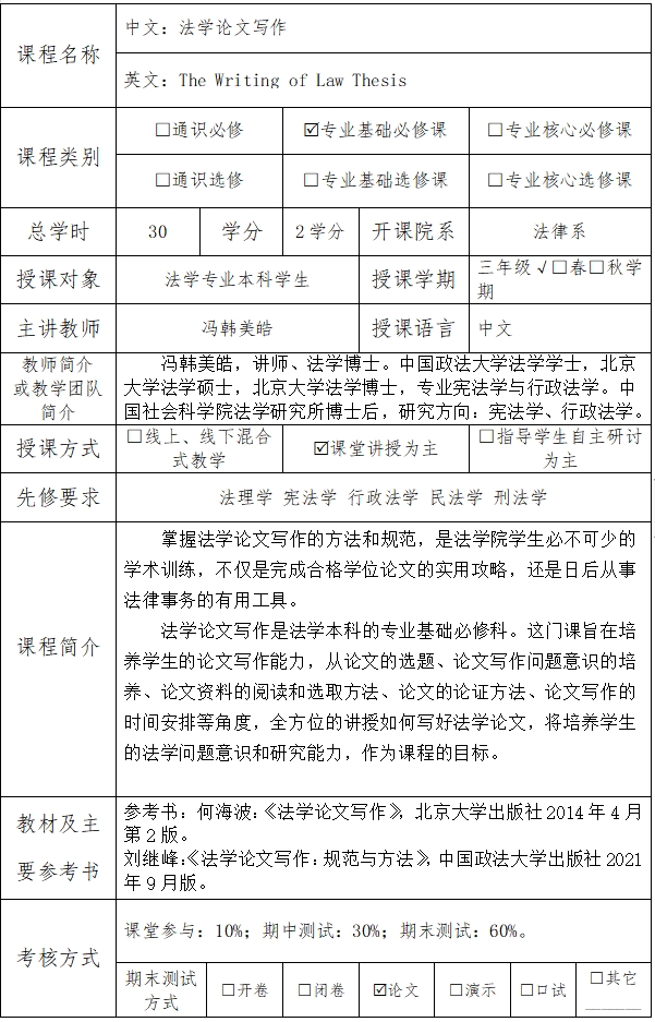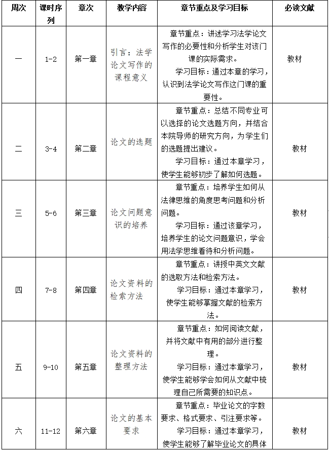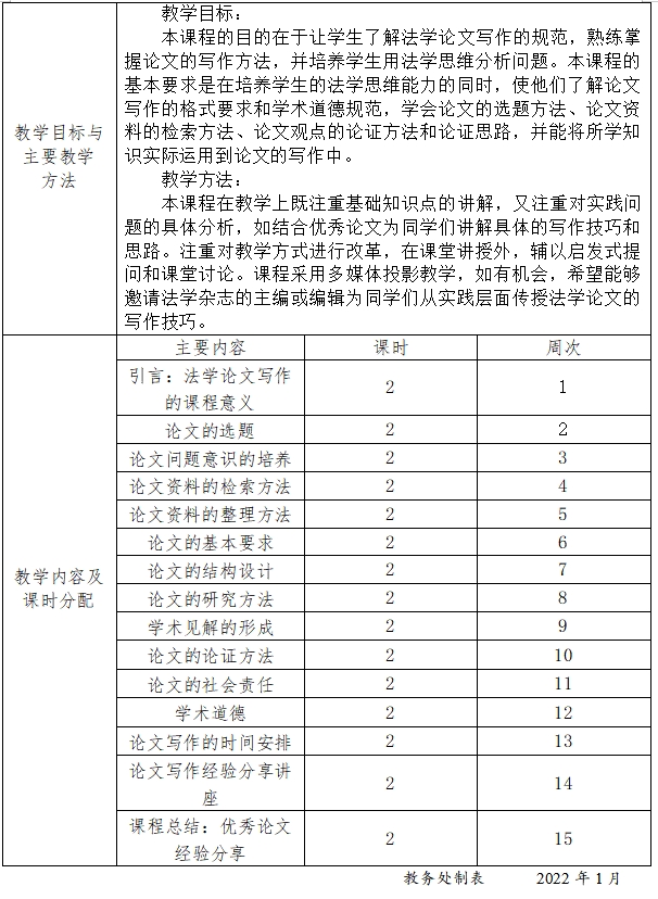 教学方式:本课程在教学上既注重基础知识点的讲解,又注重对实践问题的具体分析,如结合优秀论文为同学们讲解具体的写作技巧和思路。注重对教学方式进行改革,在课堂讲授外,辅以启发式提问和课堂讨论。课程采用多媒体投影教学,如有机会,希望能够邀请法学杂志的主编或编辑为同学们从实践层面传授法学论文的写作技巧。