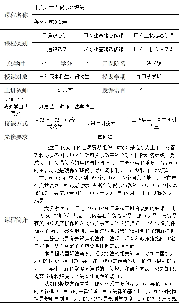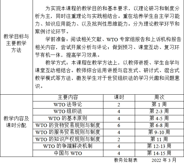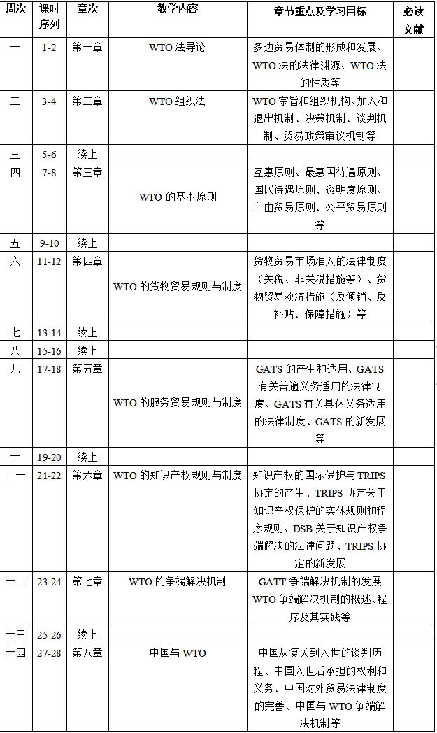 从知识板块方面来看,课程体系主要包括WTO法导论、WTO的运行机制、WTO的法律渊源、WTO法律的基本原则、WTO的货物贸易规则与制度、WTO的服务贸易规则与制度、WTO的知识产权规则与制度、WTO 争端解决机制、中国与WTO等内容。