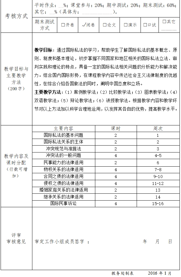 教学方式:以国际私法基本知识讲授与案例分析相结合的教学方式为主,辅之以自学和少量作业。要求员工认真阅读教材及参考文献,完成书面作业。