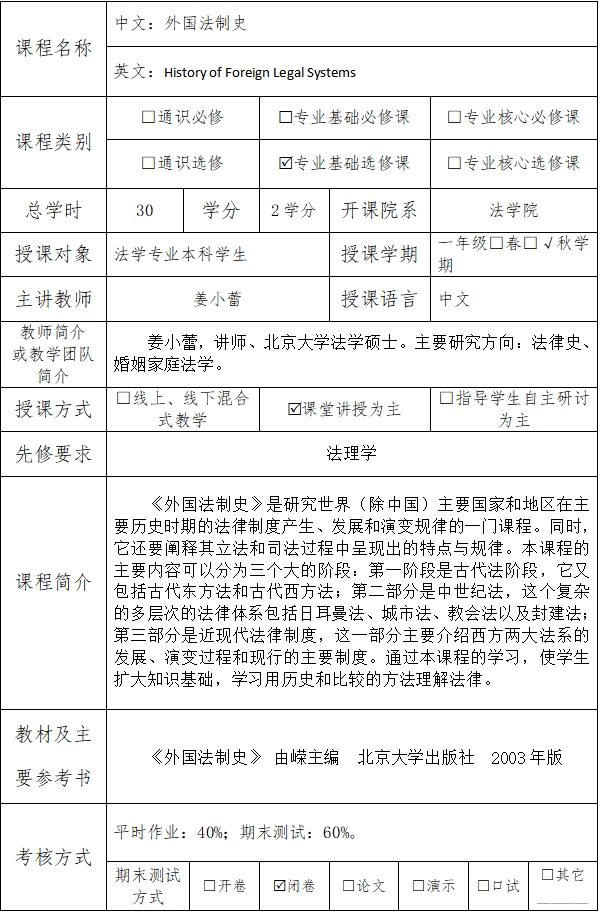 课程英文名称:History of Foreign Legal Systems