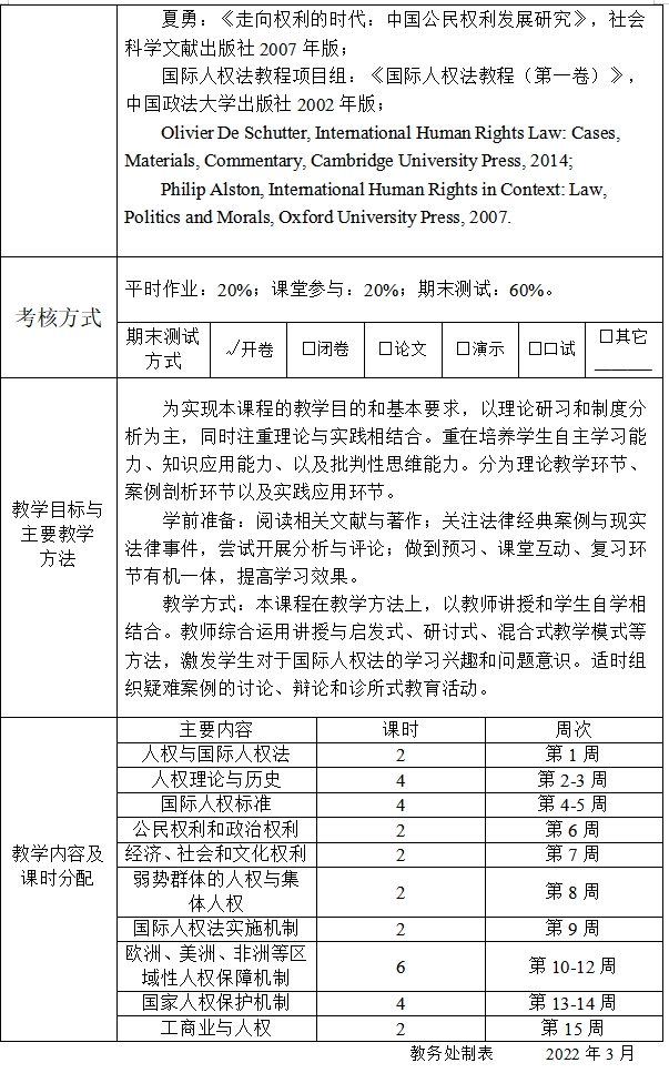 教学方式:本课程在教学方法上,以教师讲授和员工自学相结合。教师综合运用讲授与启发式、研讨式、混合式教学模式等方法,激发员工对于国际人权法的学习兴趣和问题意识。适时组织疑难案例的讨论、辩论和诊所式教育活动。