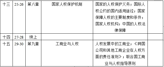 从知识板块方面来看,课程体系包括人权的基础理论与历史发展;国际人权标准;公民权利和政治权利;经济、社会和文化权利;弱势群体的人权;国际人权保护机制;国家人权保护机制;工商业与人权等。员工要了解相关制度的历史与现状,学会从国际法角度思考人权法律价值的保护与实现。通过本课程学习,不仅要强化现代人权理念,更要促进加深对国际法、国际关系中人权议题的系统认知。
