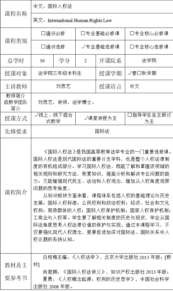 《国际人权法》是我国高等教育法学专业的一门重要选修课。国际人权法是现代国际法的重要分支学科,也是整个人权法律制度的有机组成部分。学习国际人权法,既能了解和掌握该领域的相关规则和研究方法,积累知识,提高分析和解决专业问题的能力;又能增强现代民主、法治和人权观念,增加从人权角度观察问题的思考角度。
