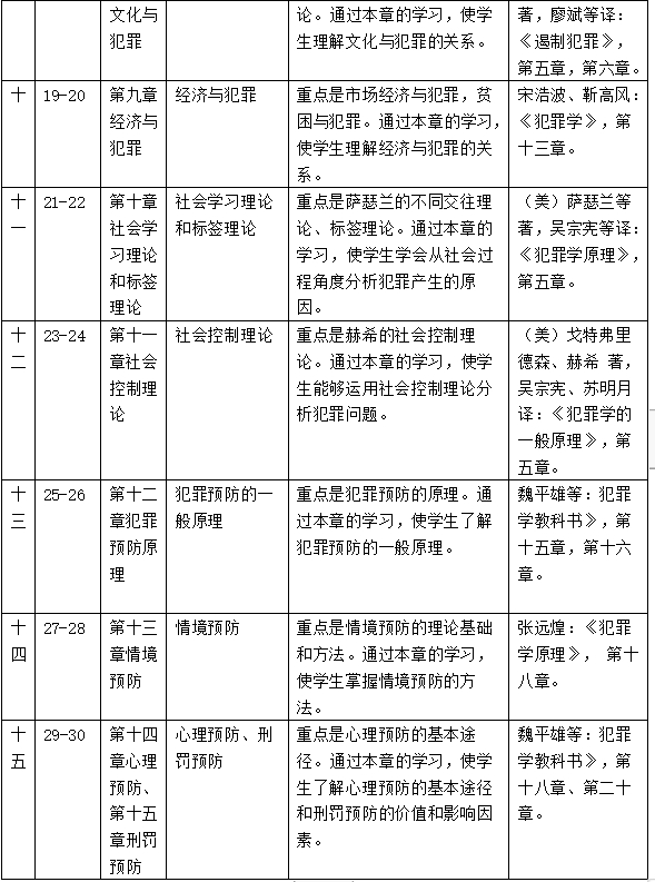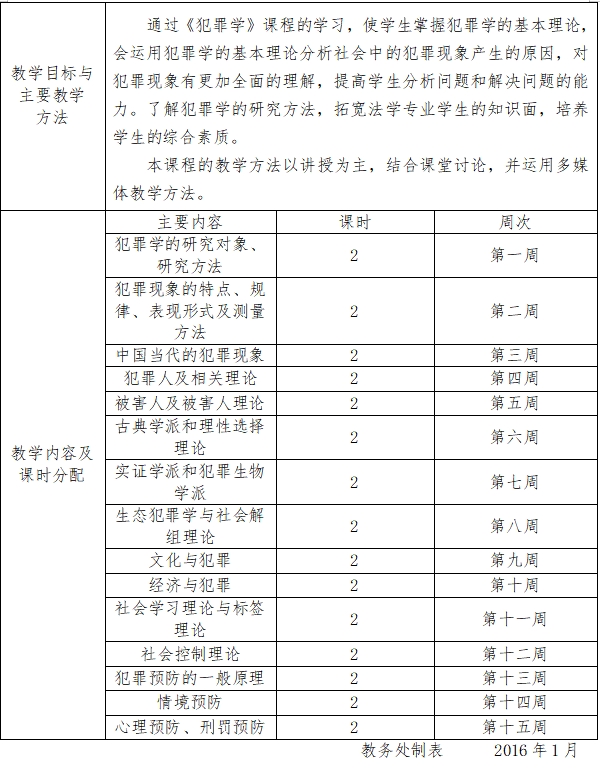 根据公司教学计划的整体安排,本课程的学时安排为32学时,w66利来旗舰厅一年级第二学期开设。本课程教学的主要内容包括犯罪学的历史发展、犯罪现象、犯罪人、犯罪被害人、犯罪原因的有关理论、犯罪预防等。具体安排如下: