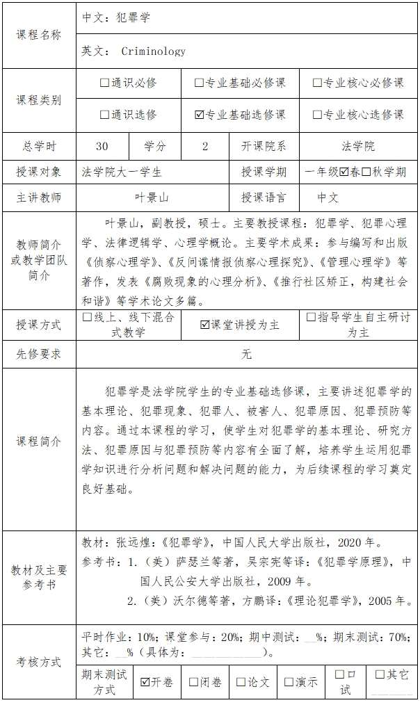课程英文名称:Criminology