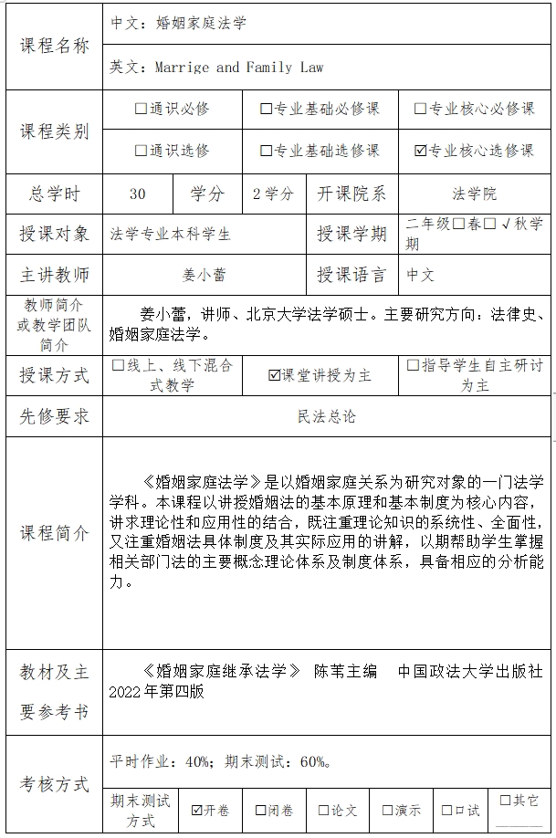 《婚姻家庭法学》是以婚姻家庭关系为研究对象的一门法学学科。本课程以讲授婚姻法的基本原理和基本制度为核心内容,讲求理论性和应用性的结合,既注重理论知识的系统性、全面性,又注重婚姻法具体制度及其实际应用的讲解。