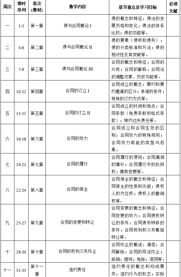 本课程的基本要求如下:(1)运用先修课程《民法学》的基础知识和思维方法,在民法框架下具体分析合同法领域的问题;(2)掌握合同“意思自治”和“物权法定”的区别,学会对比分析合同的相对性及其突破;(3)在债的体系下比较合同之债和侵权之债的区别,并理解合同编的体系下设置“准合同”的原因;(4)通过典型案例透视网络和数字时代合同法面临的挑战和机遇,了解合同法学发展前沿。