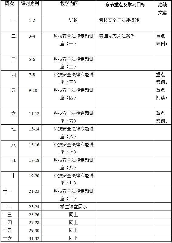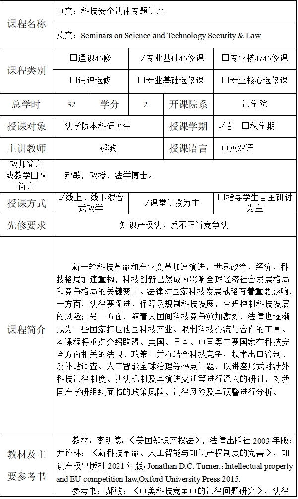 课程英文名称:Seminars on Science and Technology Security & Law