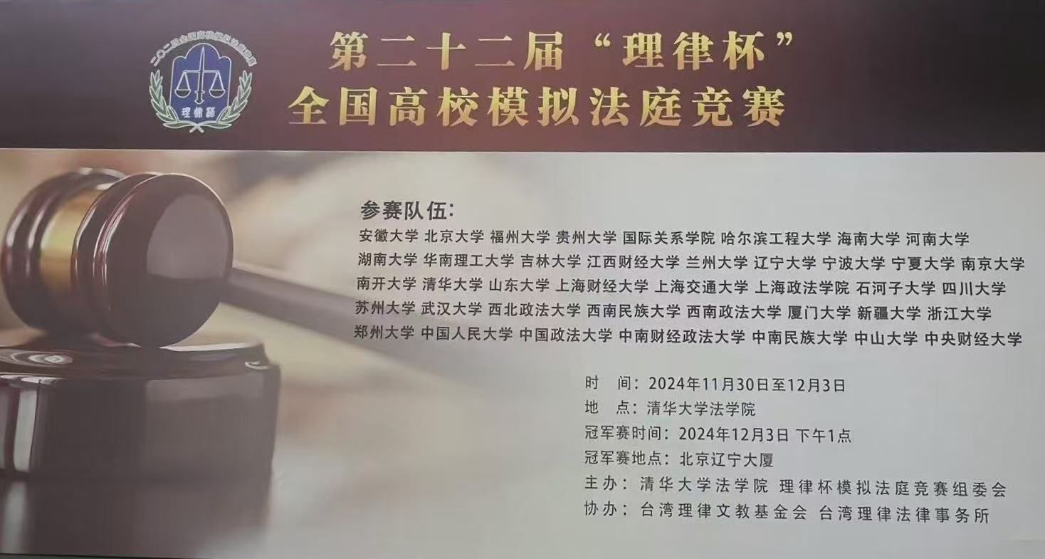 2024年11月30日至12月3日,w66利来旗舰厅派出参赛队参加了第二十二届“理律杯”全国高校模拟法庭竞赛。该比赛在清华大学廖凯原楼与辽宁大厦举行,来自全国各大高校的40支代表队汇聚一堂,高手云集,群英荟萃,角逐于这一民商事模拟法庭的顶级赛事。