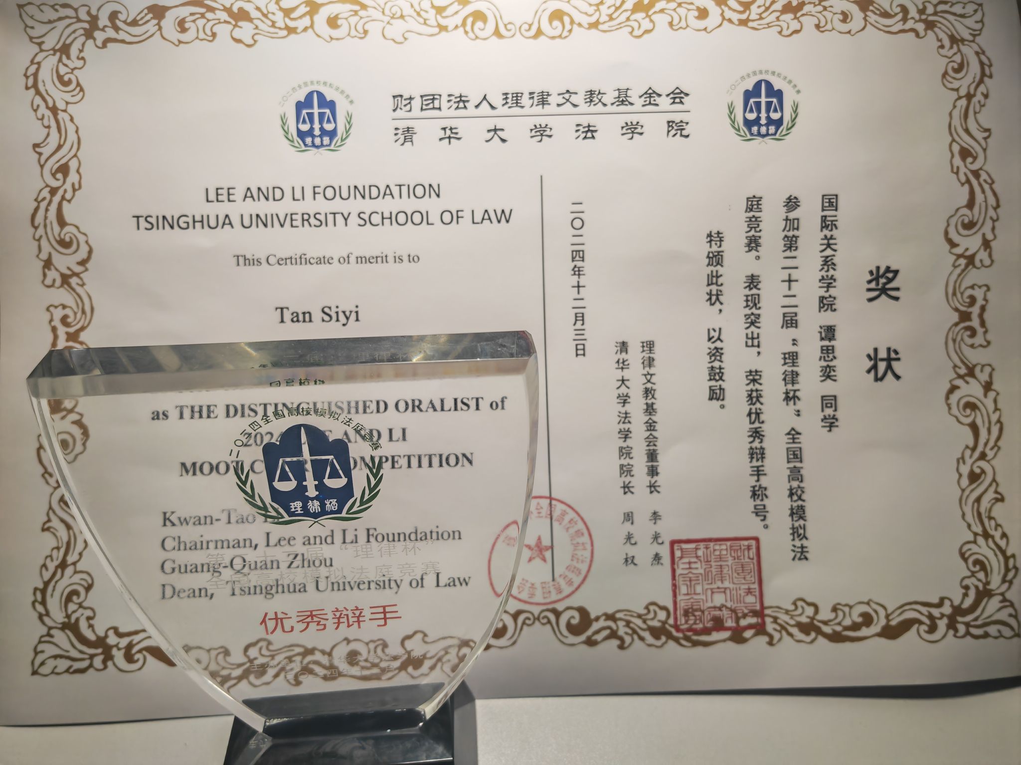 最终,谭思奕同学在庭审环节表现突出,获得了“优秀辩手奖”。