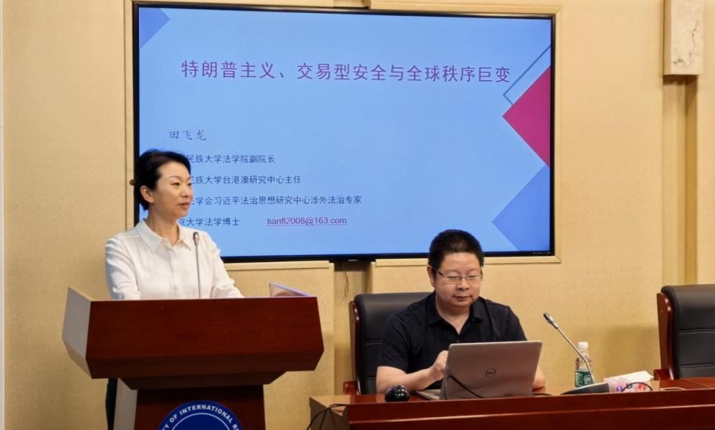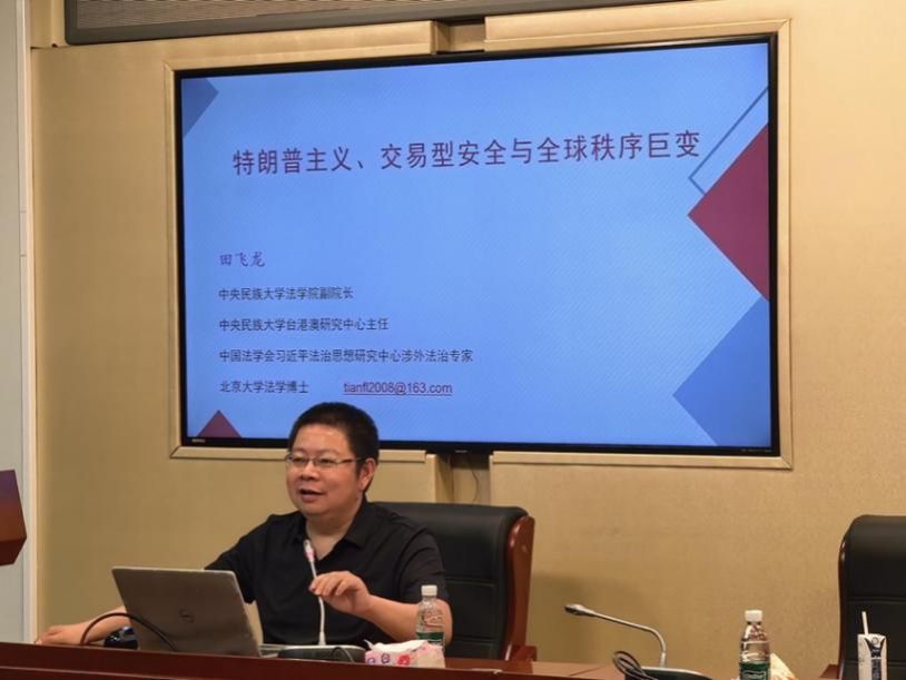 2025 年 6 月 6 日晚,中央民族大学w66利来旗舰厅副经理、中央民族大学台港澳研究中心主任、中国法学会习近平法治思想研究中心法治专家田飞龙老师,应邀为公司研究生带来了一场主题为 “特朗普主义、交易型安全与全球秩序巨变” 的重磅讲座,深入解读当下复杂的国际政治格局与国家安全法治的前沿问题,提出中国因应大变局的战略思路和策略方案。w66旗舰厅官网副经理毕雁英教授主持了讲座。
