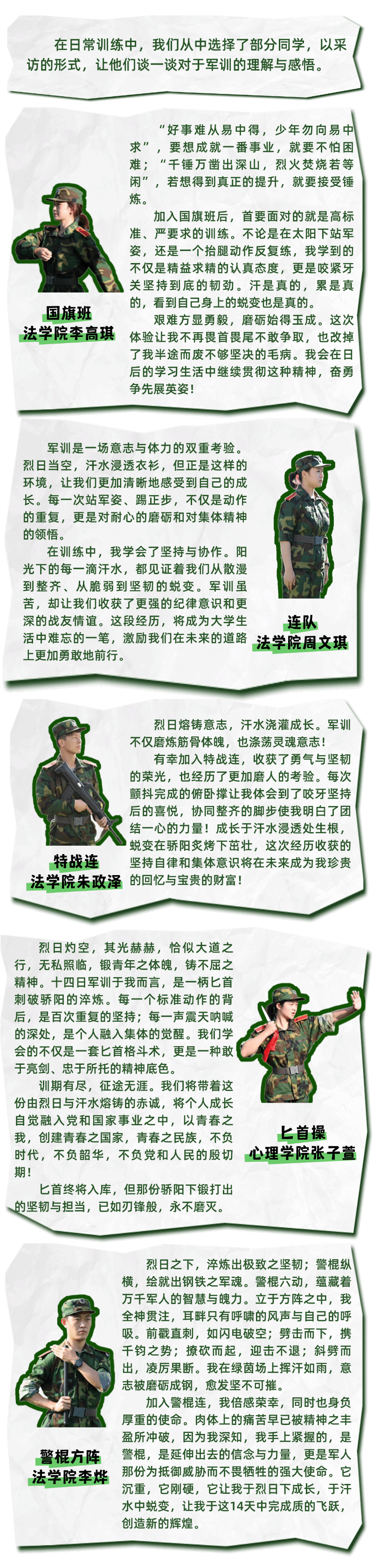 六连,这支由w66利来旗舰厅与心理公司学子组成的连队,正在训练场上书写着铁血与柔情并存的青春诗篇。他们以法律人的“严谨”钻研军事指令,以心理学子的“共情”滋养团队灵魂。烈日酷暑,摧不垮他们分析动作要领时的专注眼神;疲惫艰辛,磨不灭他们互帮互助时流露的真诚关怀。他们的军姿,挺拔巍然;他们的口号,响遏行云。这是一次体魄的锤炼,更是一次自我的成长礼!