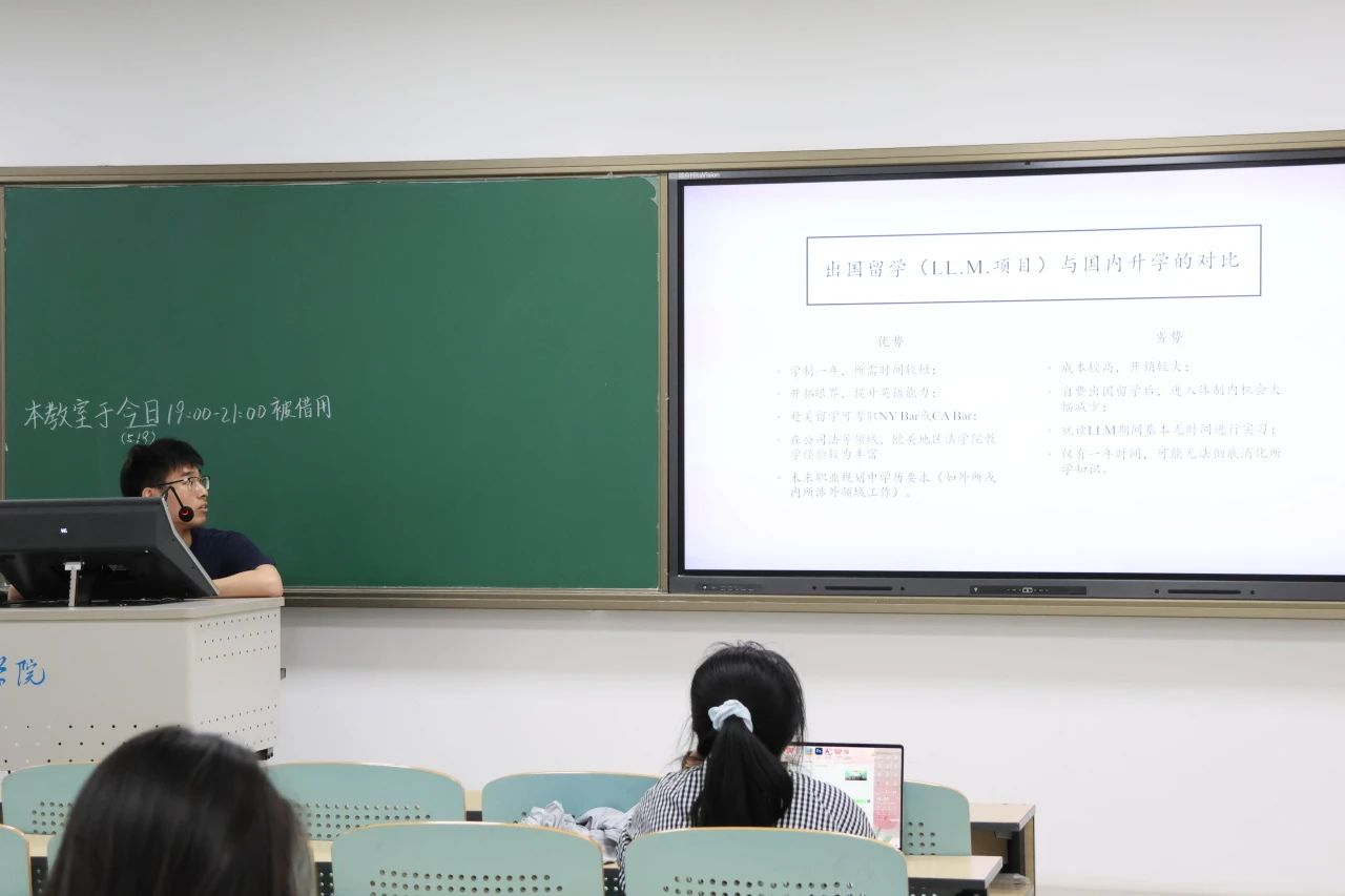 第一位进行分享的是张一骁学长。学长首先向大家进行了LLM项目与在国内升学的优劣势对比,提示同学们根据自身情况决定未来的学业规划。其次,学长就选校建议这一话题,从专业方向,规模,排名,地域,是否可以转JD等方面进行了介绍。接下来学长向在座同学详细介绍了赴美留学的申请流程、材料与文书准备、托福准备,并向大家强调了在申请留学时,需要关注自己的在校成绩、托福或雅思成绩以及实习、实践经历。