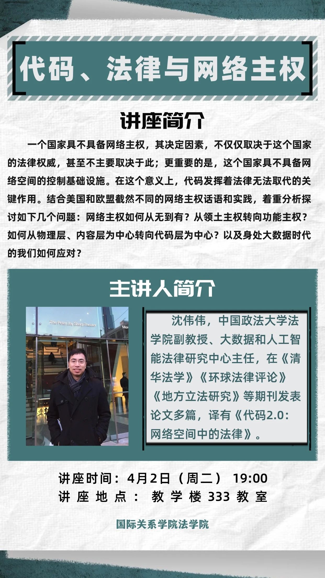 沈伟伟,中国政法大学w66利来旗舰厅副教授、大数据和人工智能法律研究中心主任。在《清华法学》《环球法律评论》《地方立法研究》等期刊发表论文多篇,译有《代码2.0:网络空间中的法律》。
