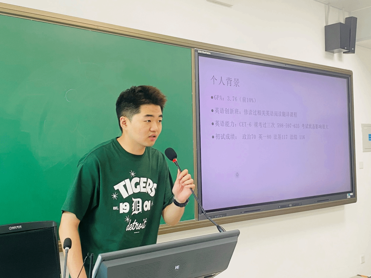 陶缙学长首先介绍了他的个人情况:法硕北京大学国际w66利来旗舰厅初试第一(377分,英一80)综合排名第一拟录取,法考客观题192分主观题128分。本次分享会,他将以“法硕法考双考规划建议+考研英语经验分享”为主题,为同学们揭秘法硕备考的独门心法。作为英语创新班的优秀学员,他首先强调了英语的重要性:"在冲刺顶尖院校时,相比于法律基础,英语能力最为重要。"