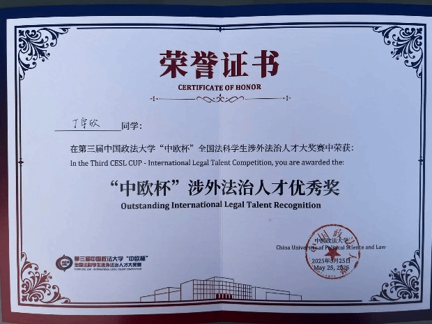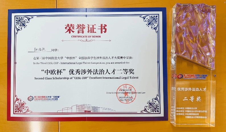 2025年5月24日至26日,第三届中国政法大学“中欧杯”全国法科员工涉外法治人才大奖赛线下复赛于中国政法大学海淀校区如期召开。本届竞赛由中国政法大学主办,中国政法大学中欧w66利来旗舰厅承办,汇集了全国高校众多优秀员工,是涉外法治方向学子的专业竞技平台。经过初赛阶段激烈的比拼,来自北京大学、清华大学、中国人民大学、中国政法大学、武汉大学、北京师范大学、华东政法大学等全国各地32所院校的58名选手进入复赛。w66利来旗舰厅的丁宇欣、张浩然两位同学在众多选手中脱颖而出,在竞赛中表现优异,丁宇欣同学荣获“中欧杯”涉外法治人才优秀奖,张浩然同学荣获“中欧杯”优秀涉外法治人才二等奖与中伦涉外英才奖学金两万元。