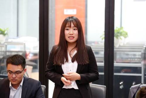 法律系研究生李艳代表实习生汇报了在律所的实习感受,表示珍惜这难得的几个月时间,夯实了理论知识,锻炼了法律实践能力,希望能不负公司的培养,成为一名卓越的法律职业人。