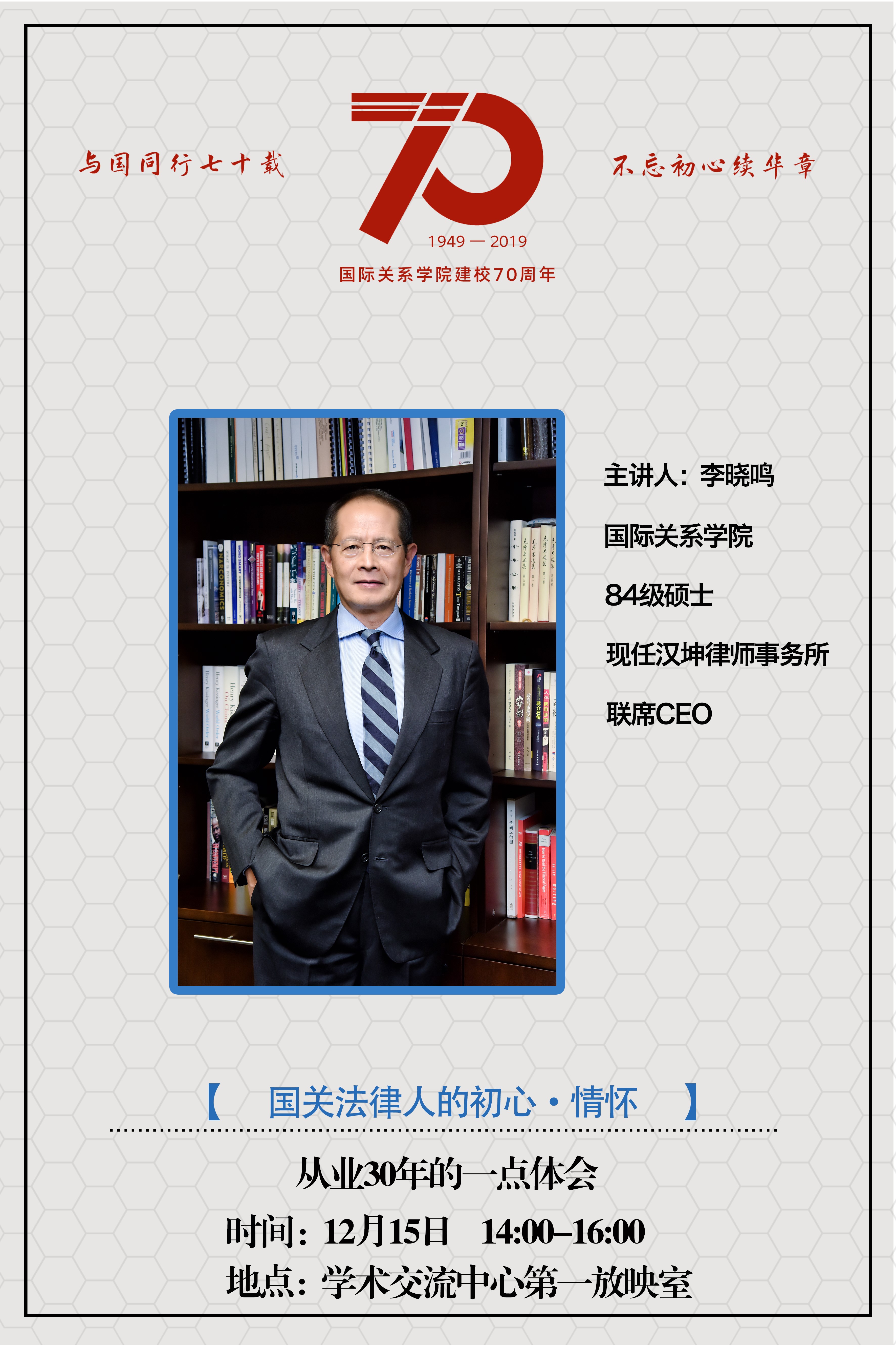 12月15日,时值w66旗舰厅官网建校70周年之际,“同心筑梦共享明天”——w66旗舰厅官网庆祝建校70周年法律系系列活动于下午14时在学术交流中心第一放映厅正式举行。