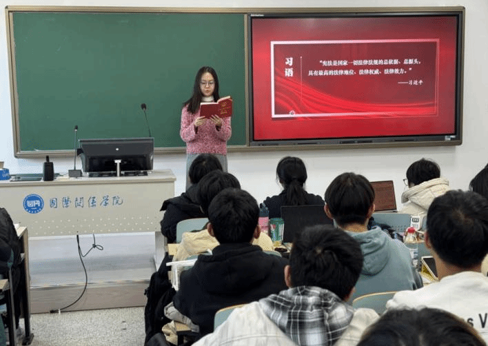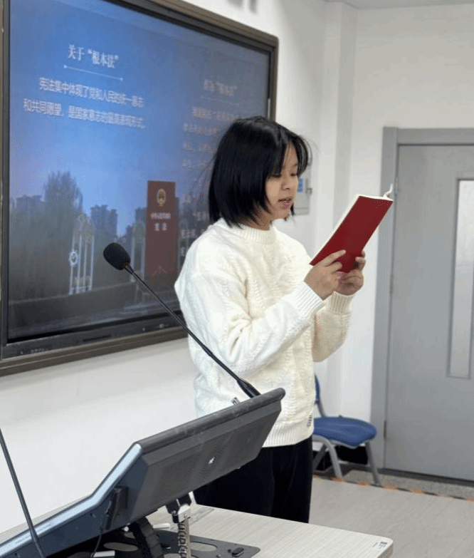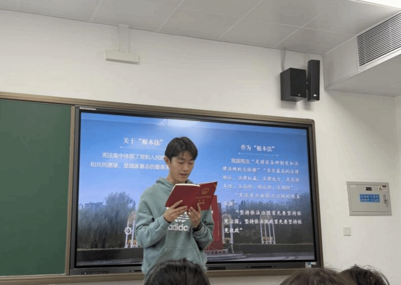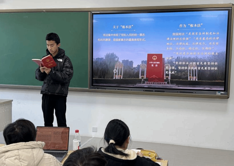 洪亮激昂的声音饱含青春信念,将“中国各族人民共同创造光辉灿烂的文化”“建设社会主义现代化强国”等语句中的精神力量传递给在场每一个人。台下学子一边诵读,一边对照“坚持依宪治国、依宪执政”主题课件,重温宪法“根本法地位”“序言核心意义”等关键内容,深刻体悟宪法作为“治国安邦总章程”的核心价值。